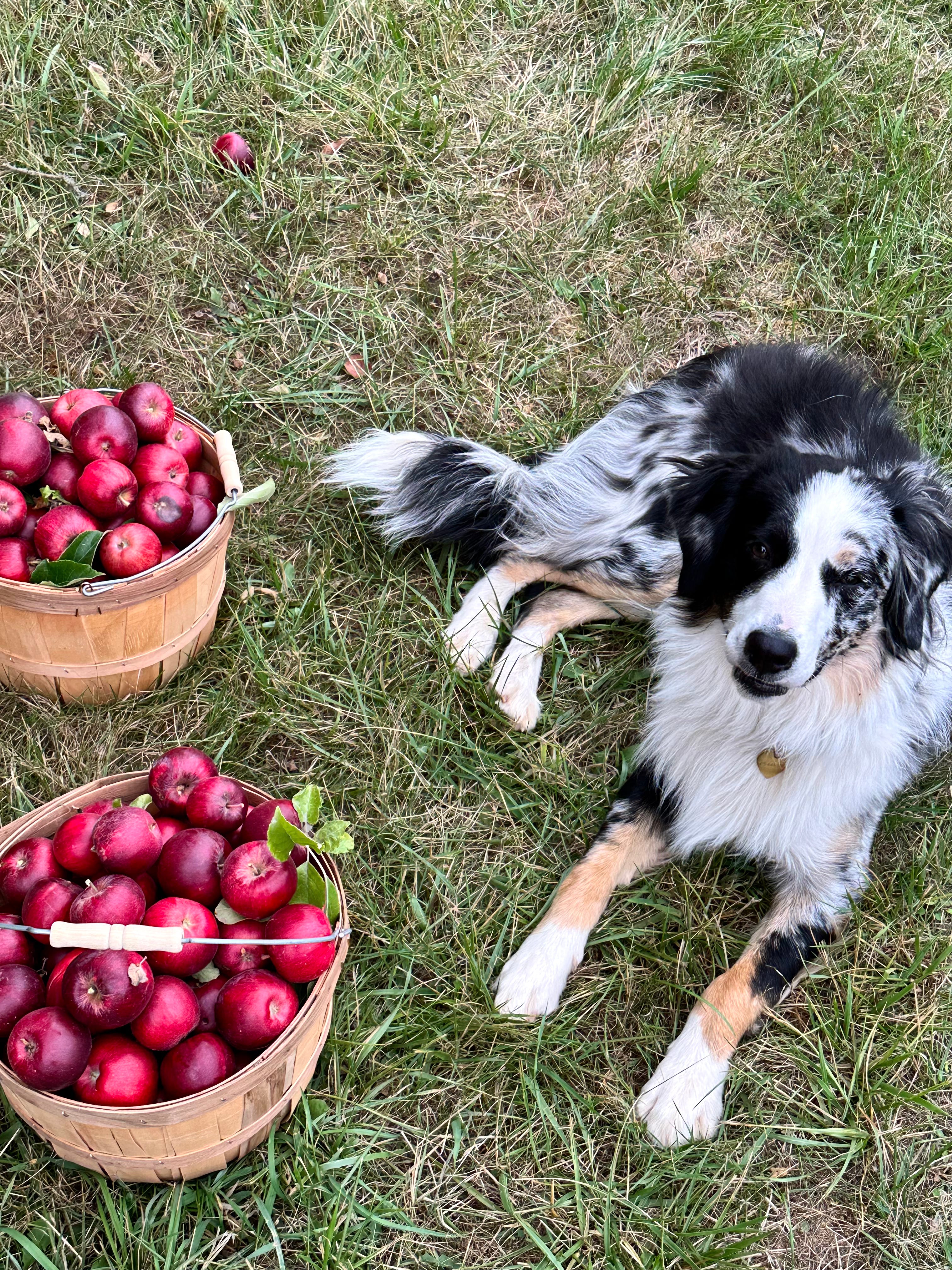 No links this week as I return to my routine, but here’s a picture of Lucy helping me with the apple harvest. I am drowning in apples this year.