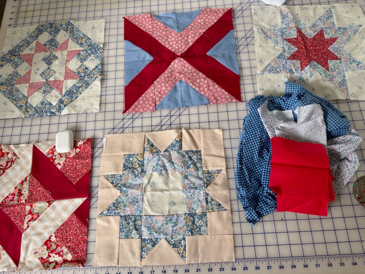 For each block, I only used what I already had. These were the leftovers from other projects that I collect in milk crates, or small lengths of fabric that I picked up years ago and never used. They’d otherwise be discarded, so I use them freely.