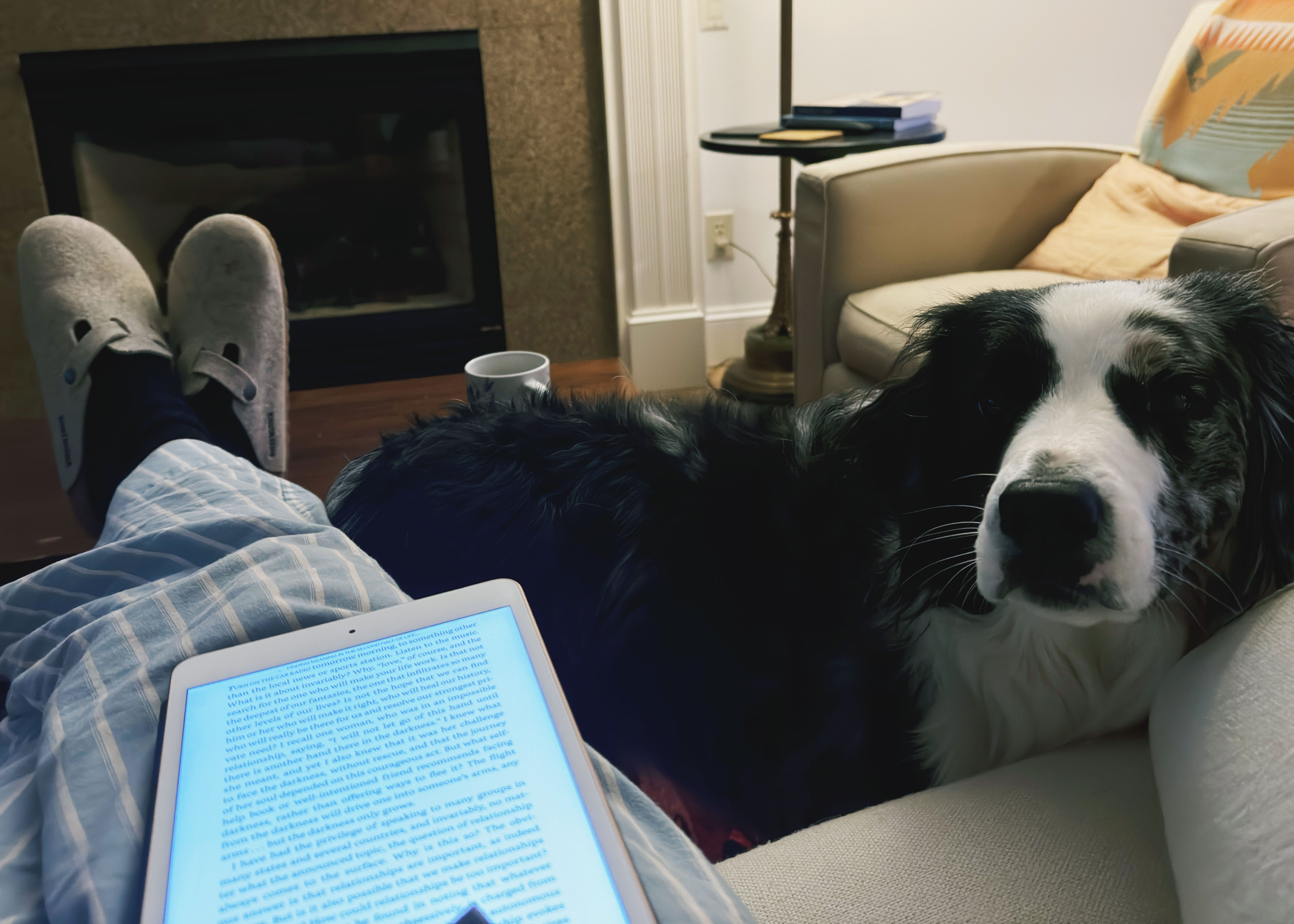 In winter, I wake up while it’s still dark, let Lucy out, then settle in on the sofa with a cup of coffee and a book for the first hour of my day. In winter, I often start a fire if it’s cold or pull up a blanket.
