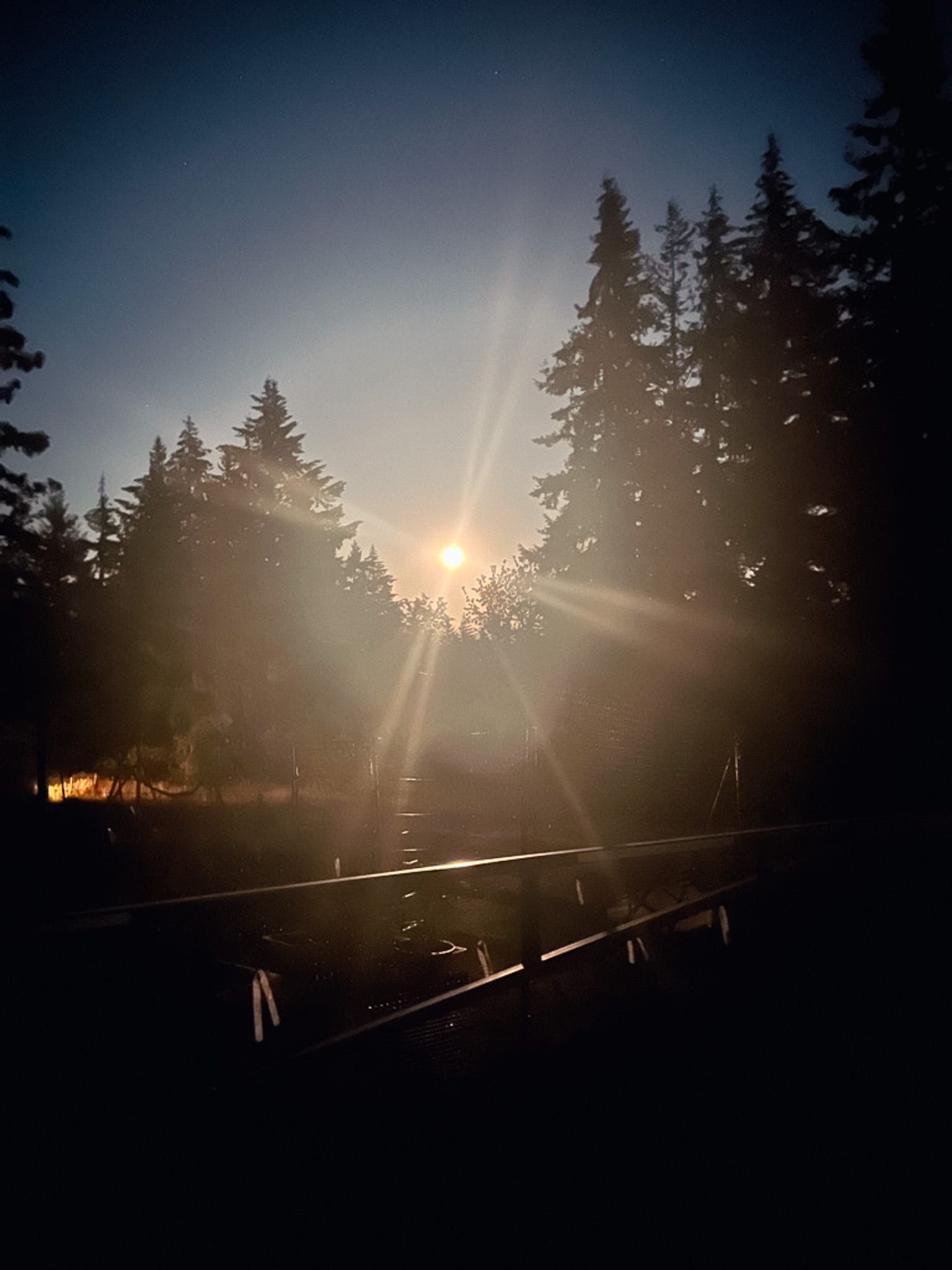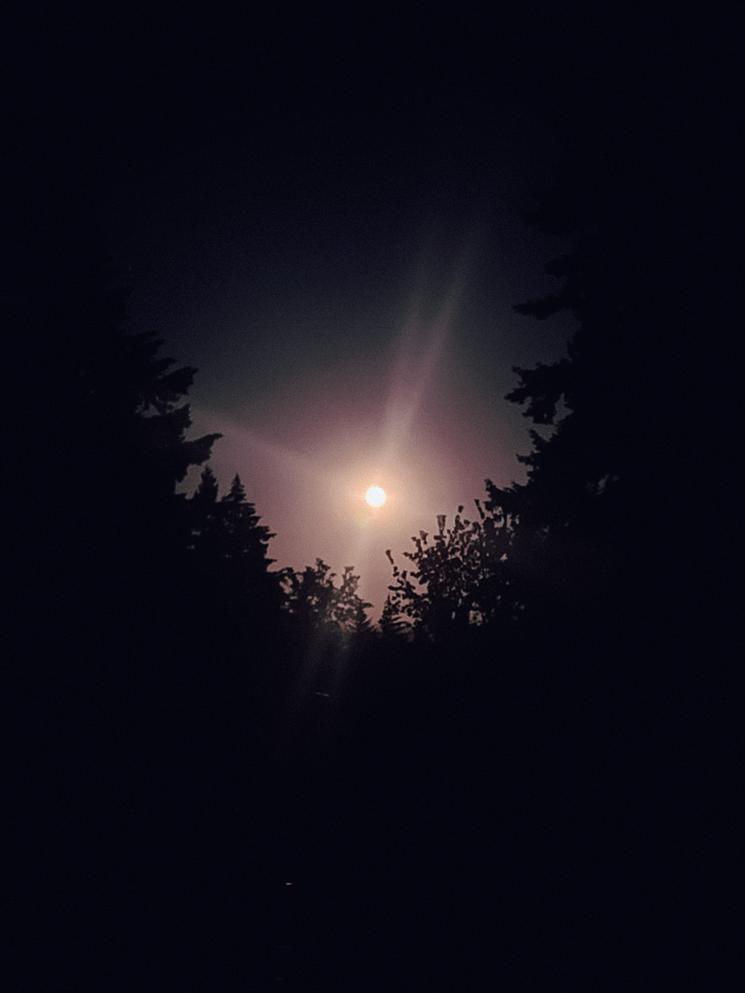 This far north, the sun doesn’t set until about 10pm in midsummer, so it was close to 11 when we stepped out; even still, it was not quite dark. At first, the moon was hidden behind the black canopy of douglas fir trees ringing the sky. But as we crunched along the gravel towards the road, a window opened up between the branches and there it was, low and glowing.