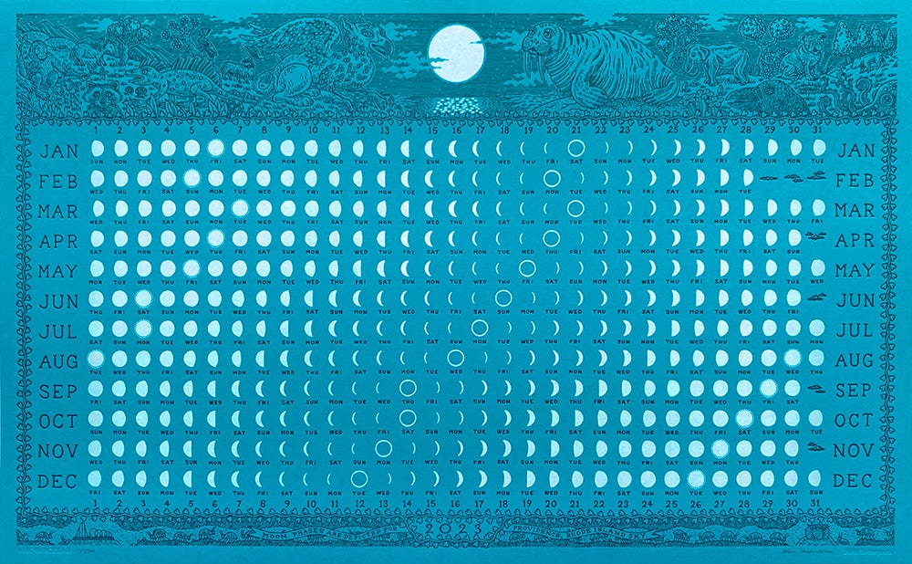 I just bought myself this big wall calendar. I guess it looks rather linear, but you could also see it as a series of cycles going both across and down the page. I’m also thinking about getting a moon phase calendar like this one by Alec Thibodeau or this witchy one that reminds me of concert posters from the 60s, but not sure if I have a place to hang one.