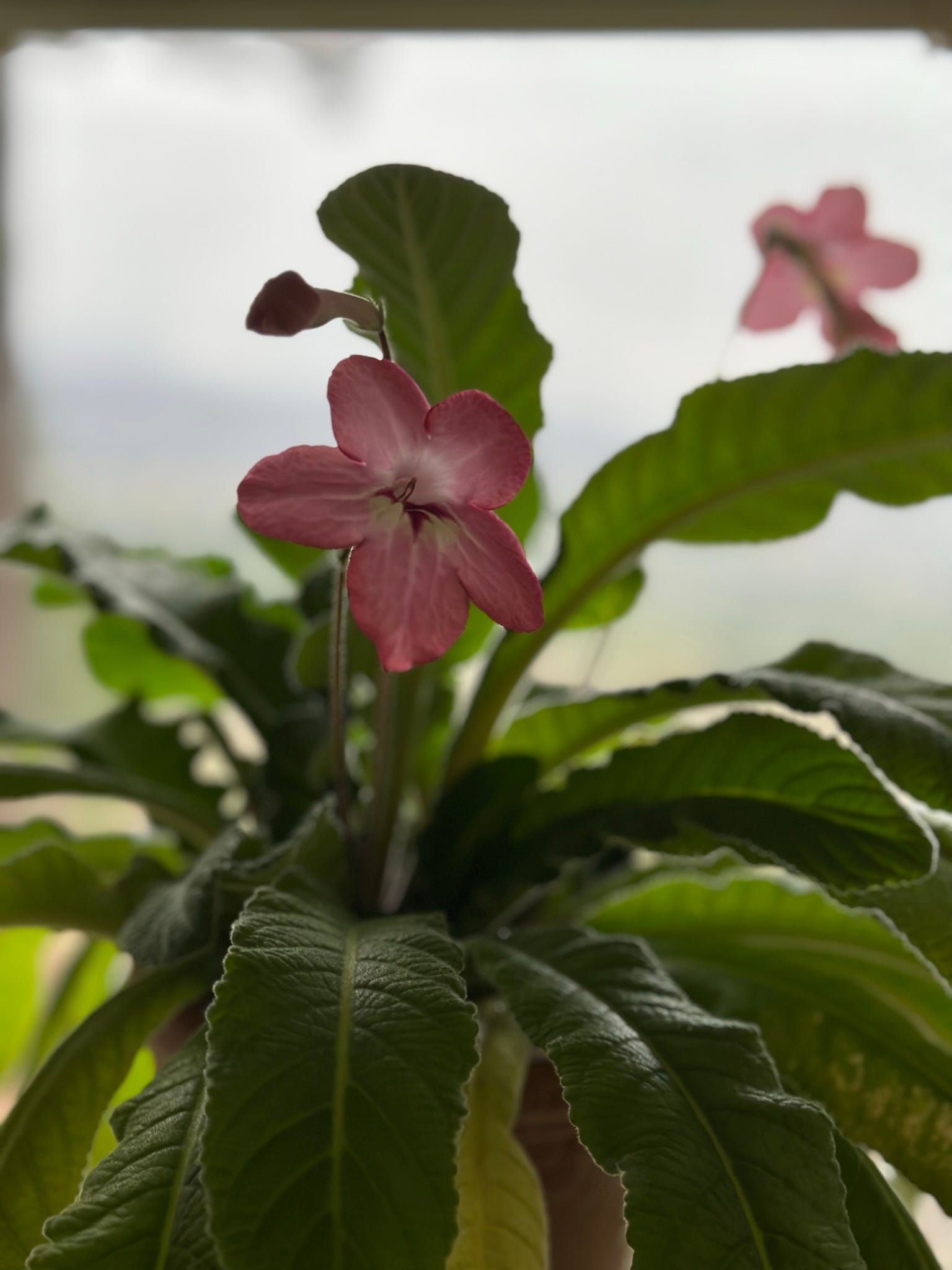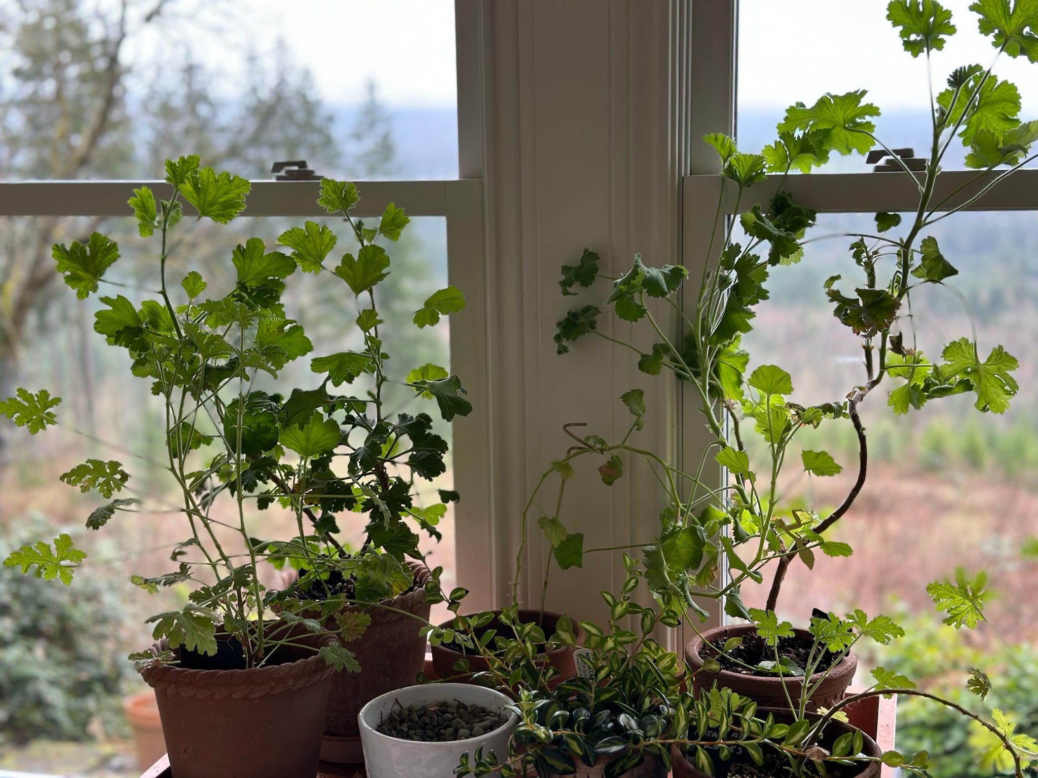 Geraniums are my favorite indoor plant, and also the one that causes me the most trouble. The scented geraniums have leaves that smell incredible and, as I’ve mentioned before, I love how weird and leggy they get indoors. It can be helpful to give them some support. Most of mine do not bloom, or at least haven’t yet, with the exception of Roger’s Delight, which I’ve mentioned before. I also have a few Attar of Roses geraniums, which seem pretty vigorous and smell nice.