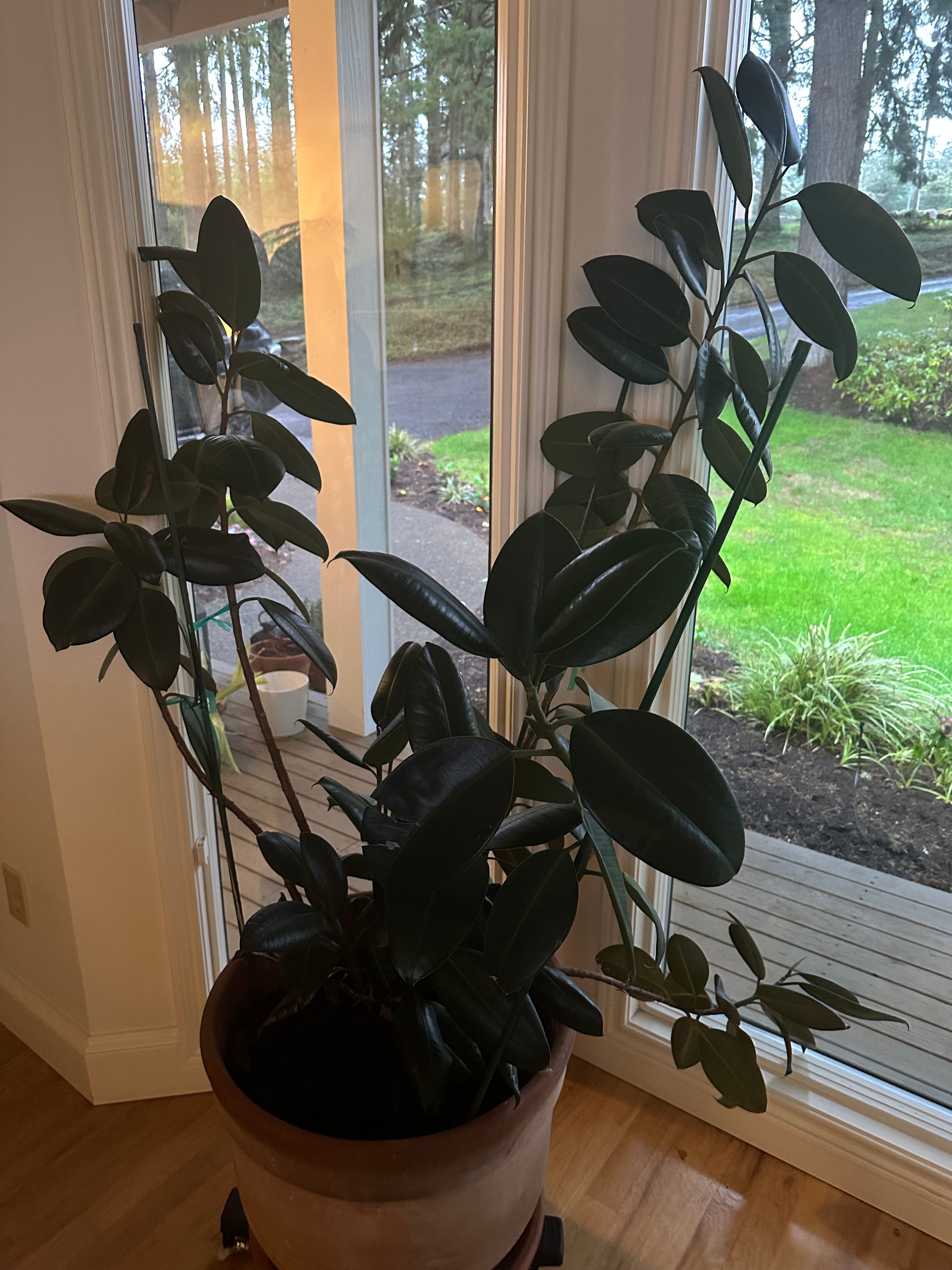 This is a very typical large indoor plant. It’s extremely easy to care for, and grows to a mighty size. It’s a beefy, hardy plant. I’ve had mine for years and years. It does need support to keep it from flopping (like that branch in front).