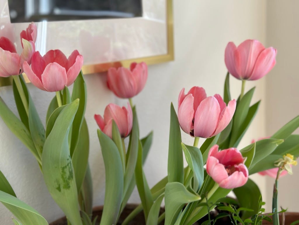 This year, I tried forcing some bulbs indoors (hyacinths, daffodils, tulips). Surprisingly, I had the most success with these tulips. They are Salmon Impression Darwin Hybrids, and I bought them in January pre-chilled. Many bulbs need a long chilling period in order to bloom, so if you want to do this in spring, you need to either plan ahead to chill your bulbs, or buy pre-chilled, like these. Tulip World is a good source for pre-chilled bulbs.