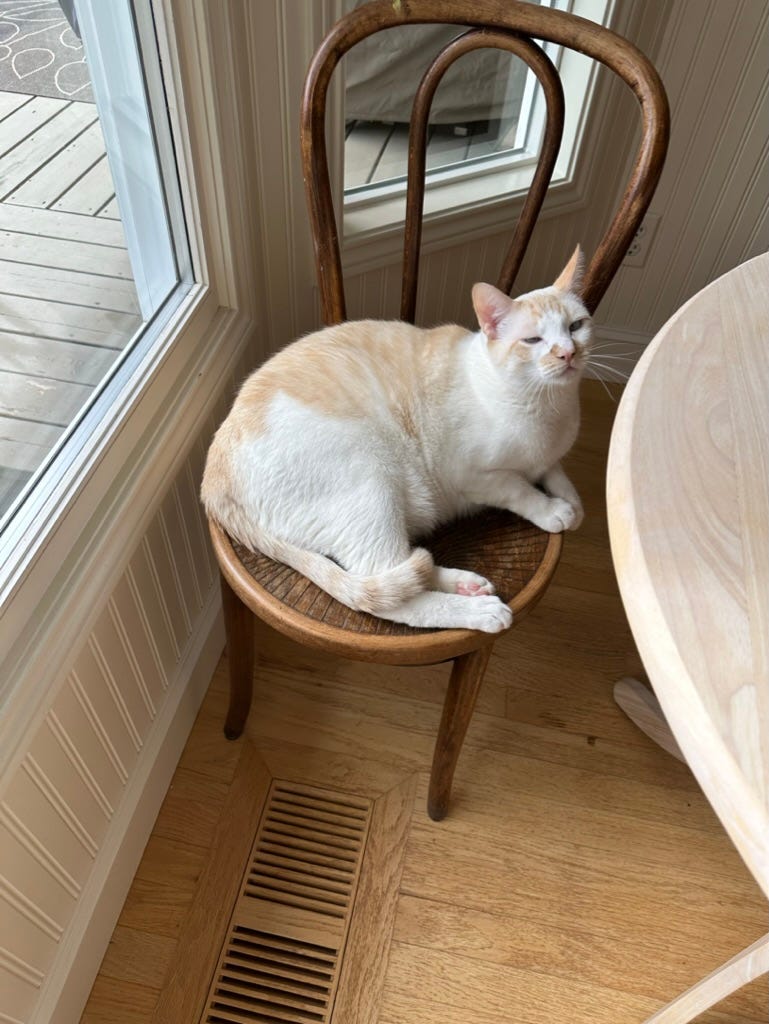 By the way, this is when I tried to compromise with them about laying on the breakfast table in order to look out the window. I moved a chair in front of it so they could enjoy the view from there instead. They both agreed that the chair was nice, but the table is better.