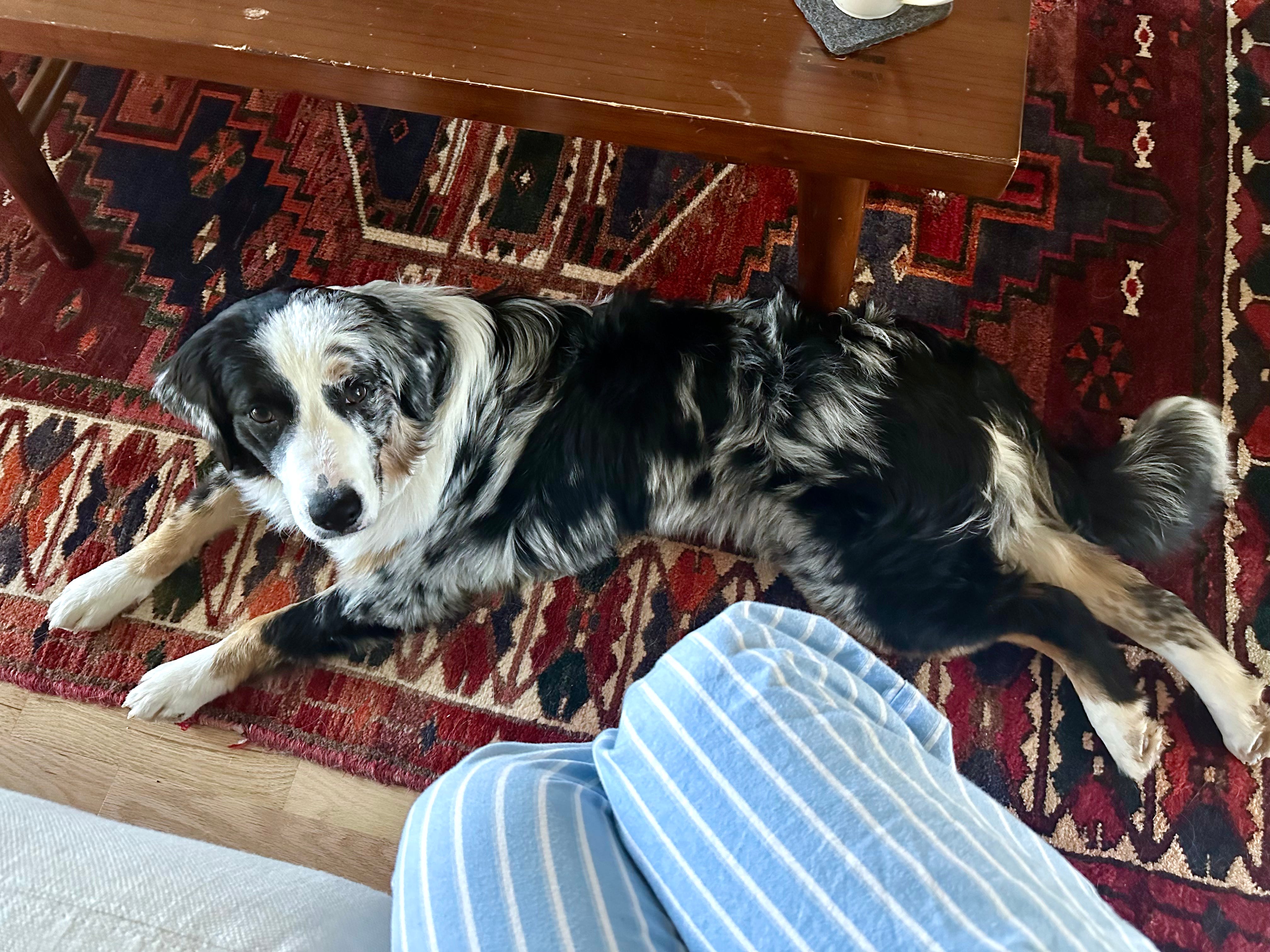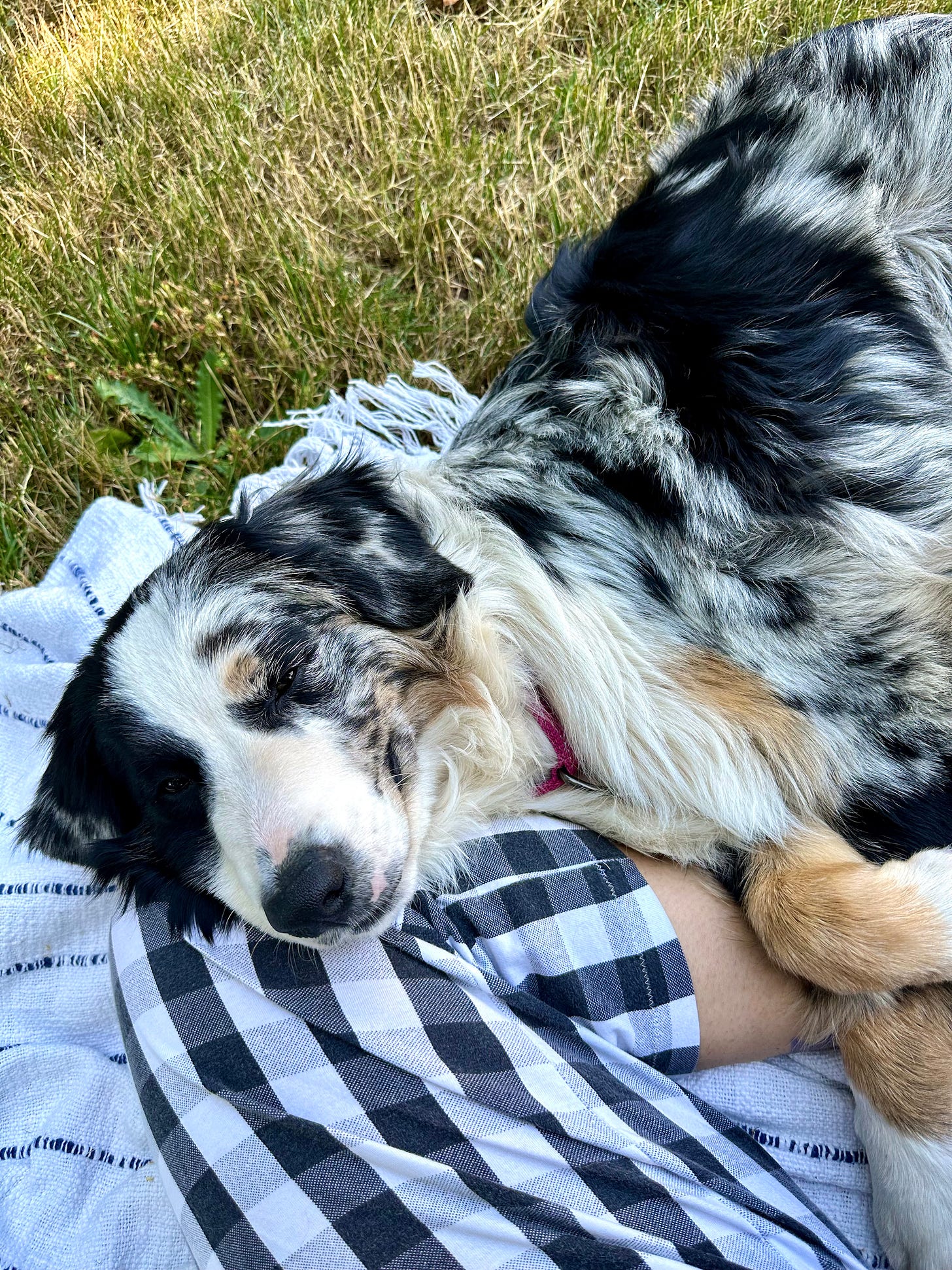 In contrast, Lucy’s needs are well defined and limited, they just require time and attention. I find myself staring out the window for long periods of time, petting Lucy until she falls asleep, rubbing her tummy, responding to what she needs as a pup. Or, as the trainer from the rescue said “just vibeing with her.”