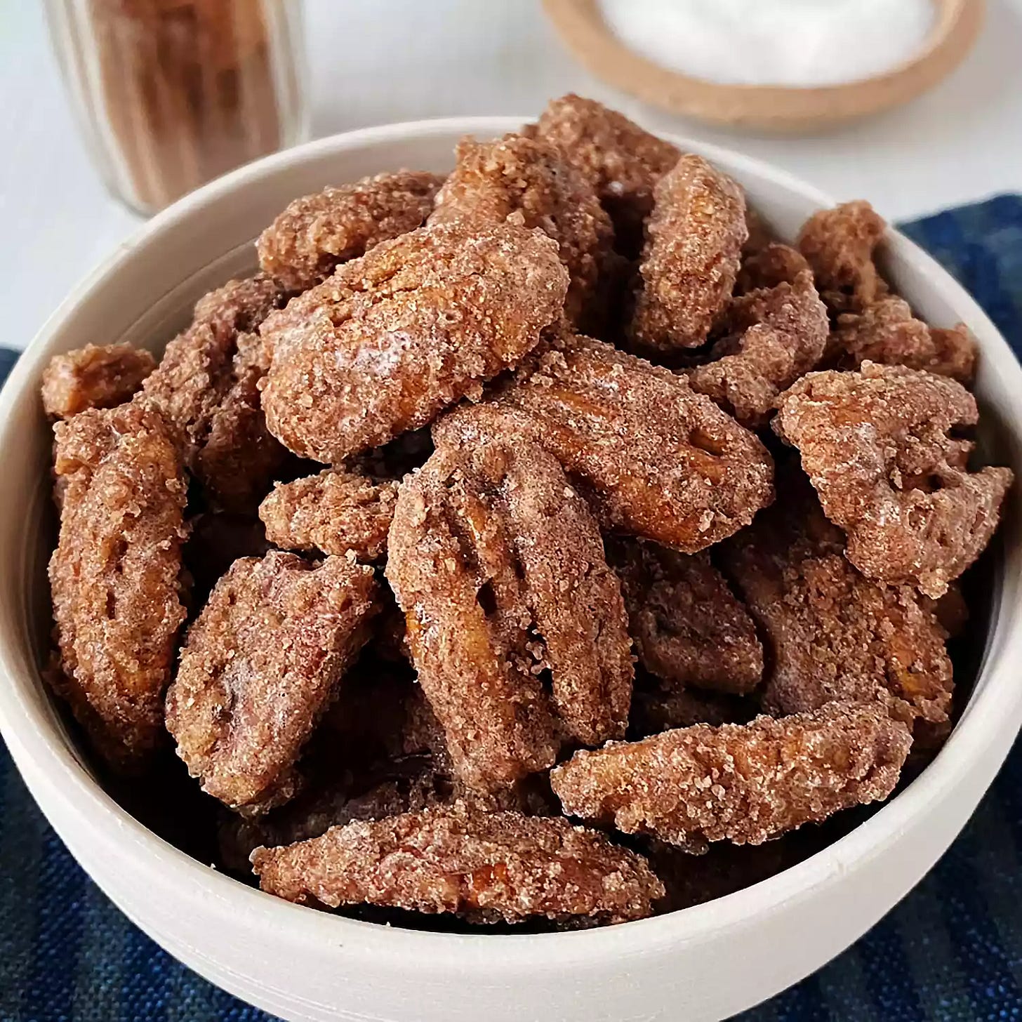 I always like to have some candied nuts on hand. When I want a salad, I just toss some greens with a simple vinaigrette, and top with candied pecans, some cheese, and fruit (fresh or dried). Fun ingredients like this will make you love salad, if you don’t already.