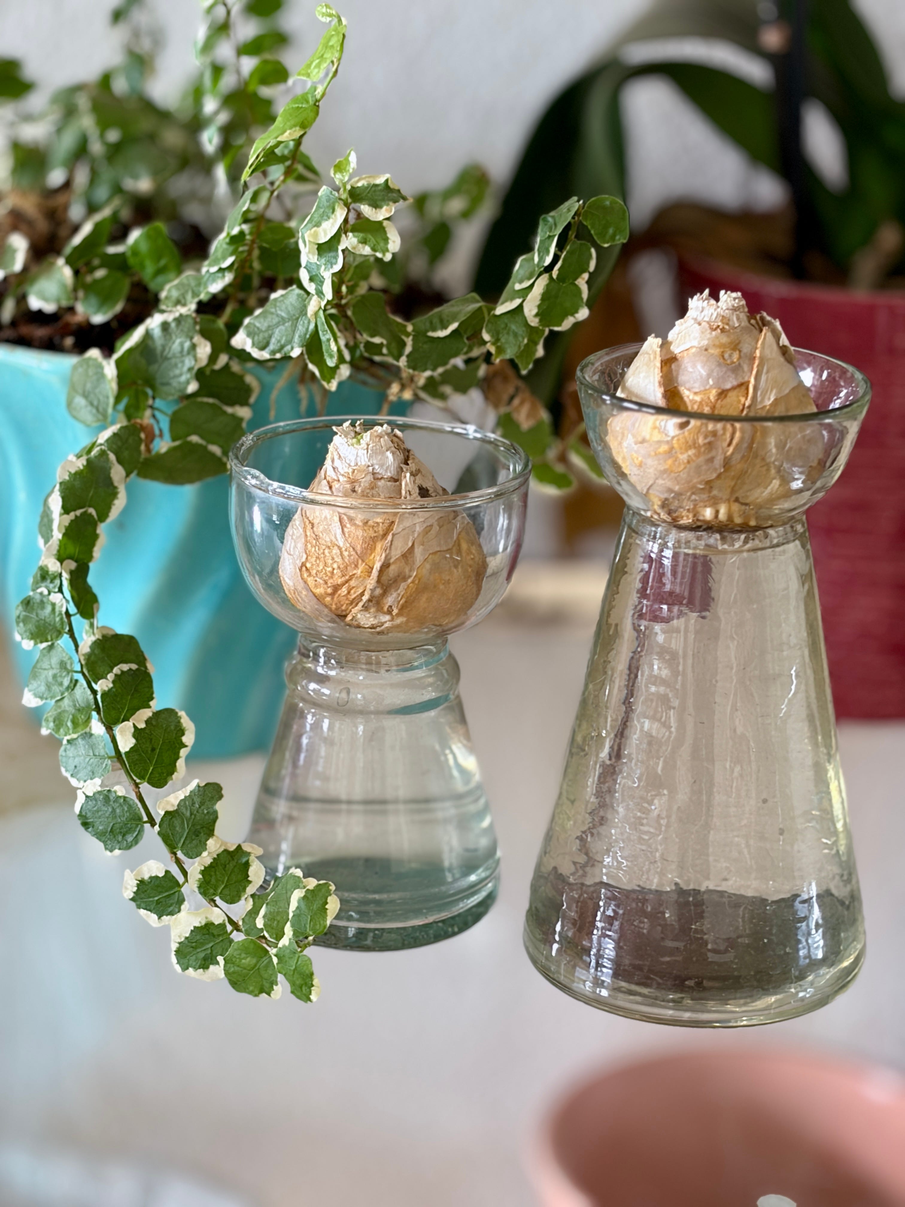 Those little glass jars you have your bulbs in are very cool 💜. I hope your bulbs grow!