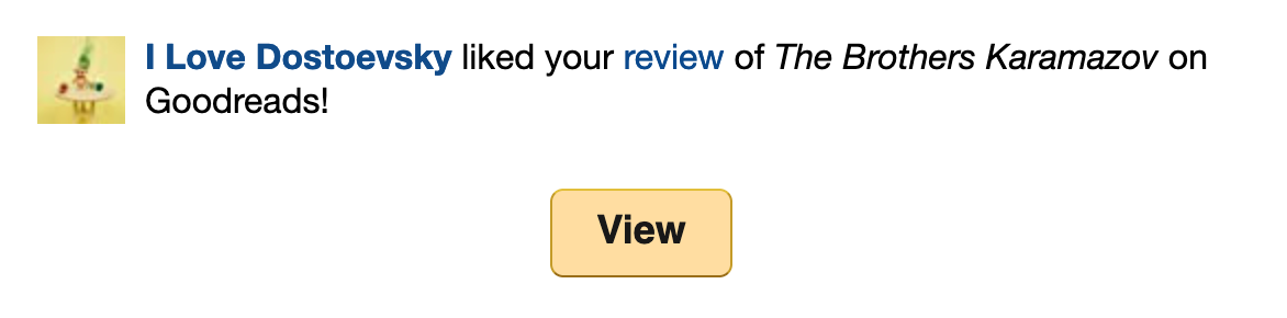This notification I received from Goodreads made me lol. Dostoevsky super fan over here. (By the way, my “review” was literally just rating the book 5 stars back in 2011.)